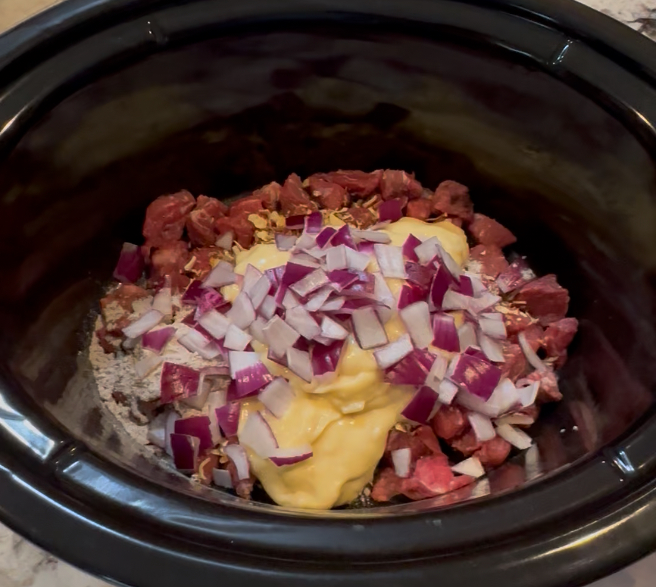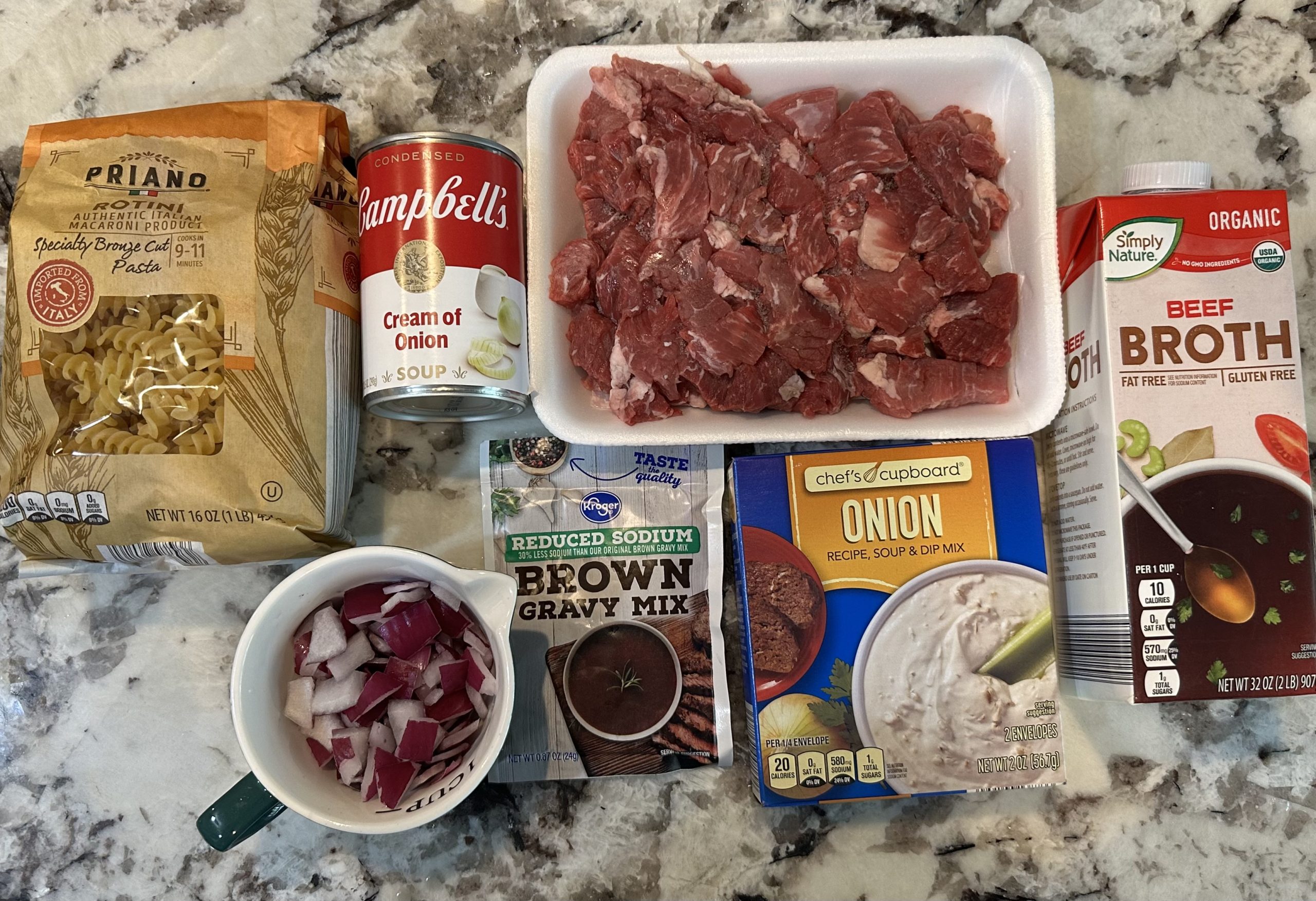 - Add 1 can cream of onion soup, 1 envelope brown gravy mix, 1 envelope onion soup mix, and 3/4 cup beef both on top of the meat.