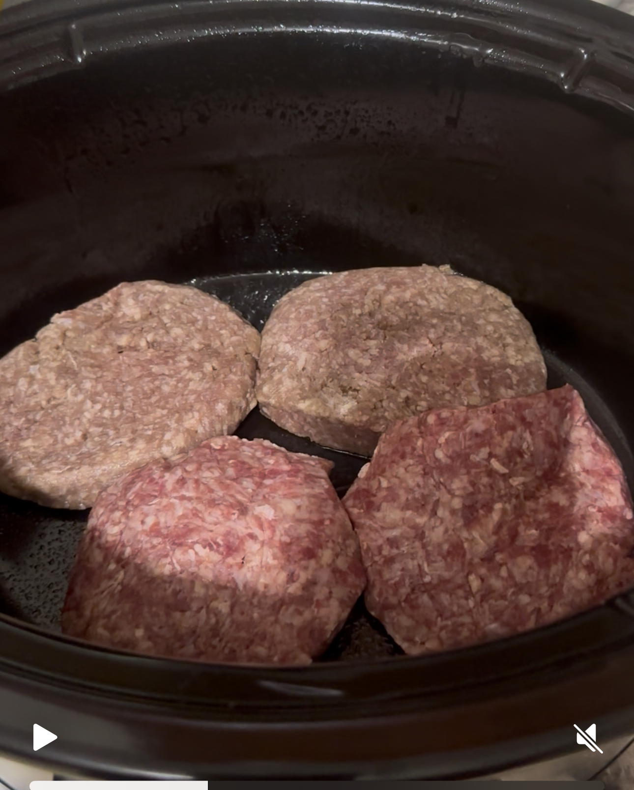 - Season burgers with Montreal steak seasoning and then place in bottom of crockpot (you can stack if they do not all fit on the bottom)